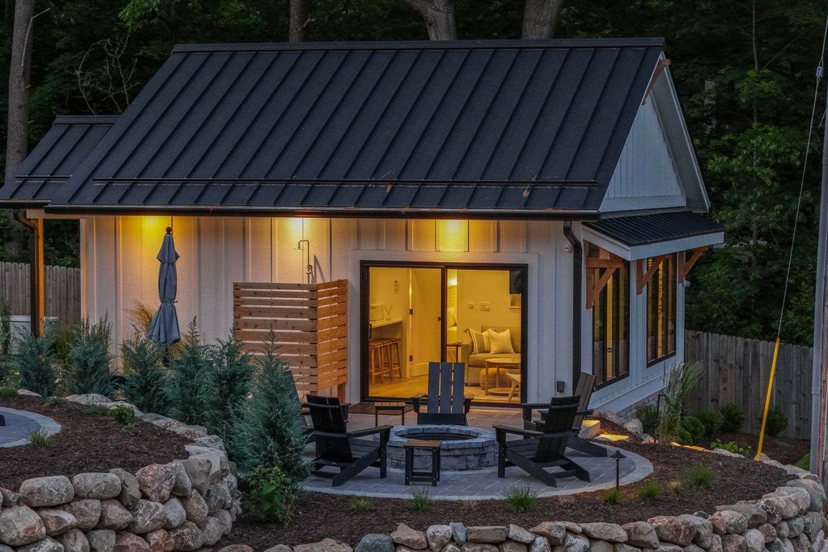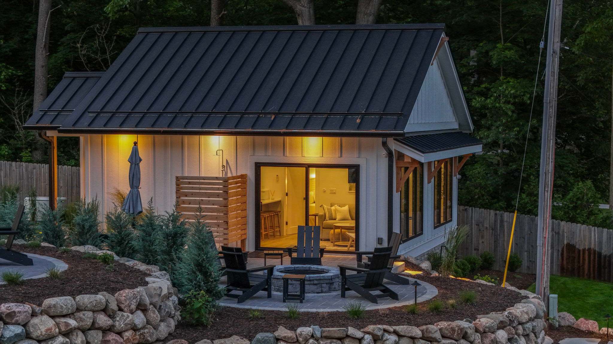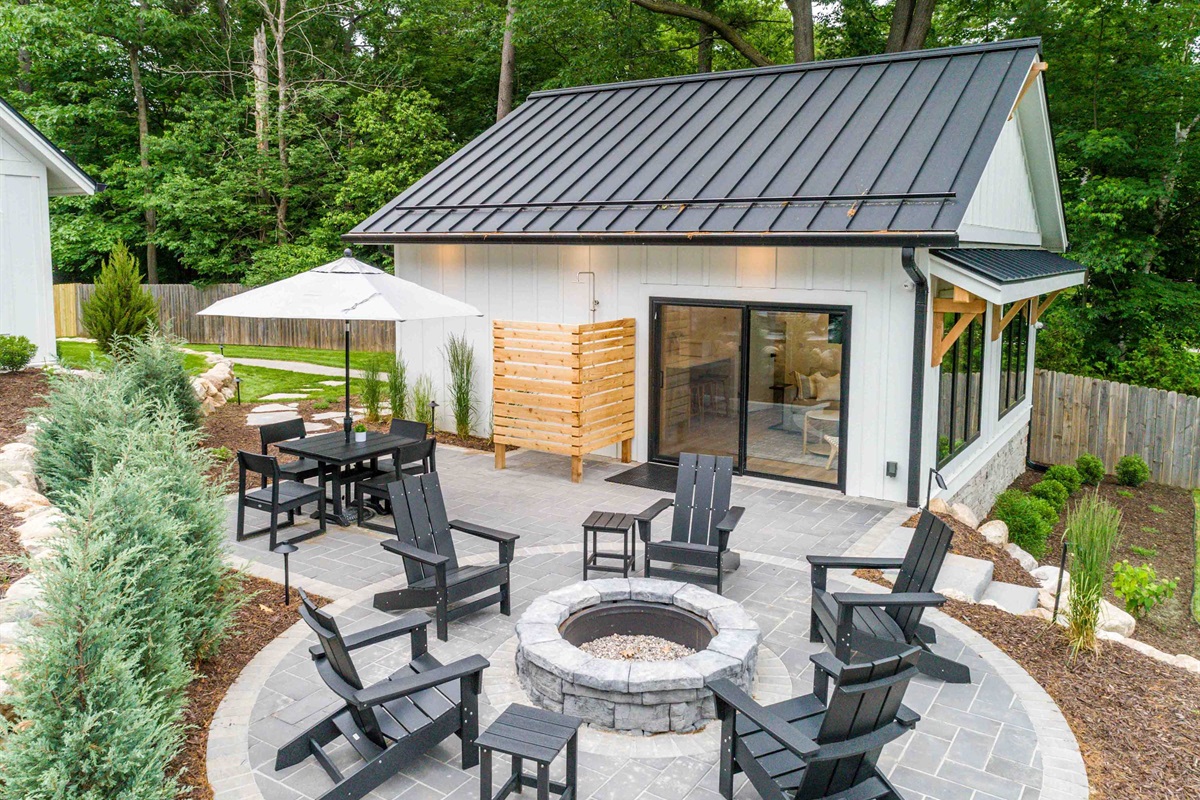 The open-concept living space creates an inviting flow, while a private outdoor dining area with a fire pit and outdoor shower offers the perfect place to unwind after a day on the lake.