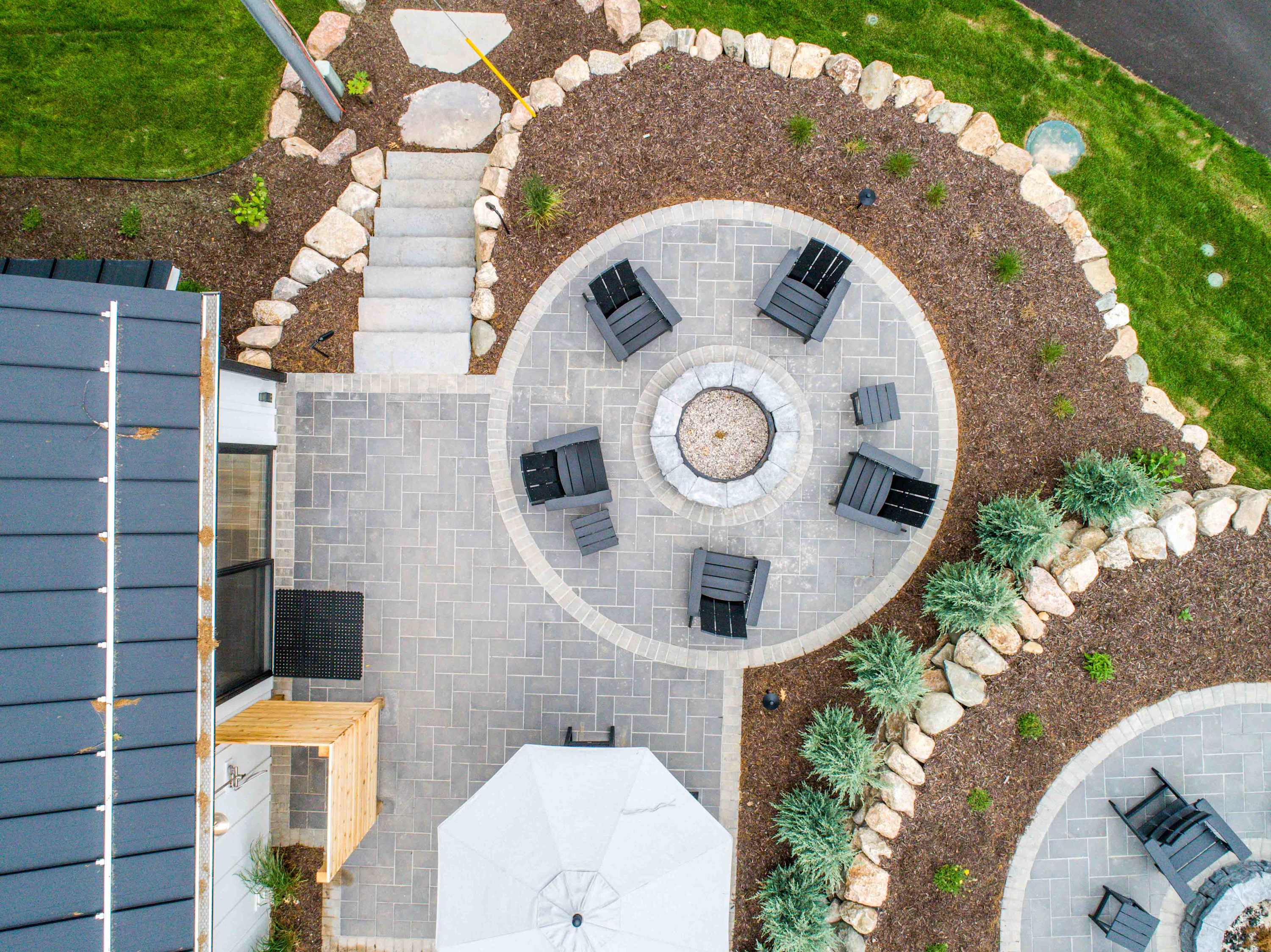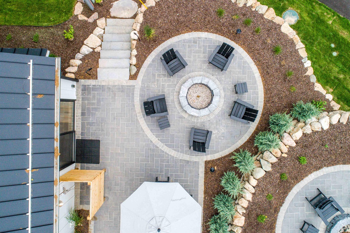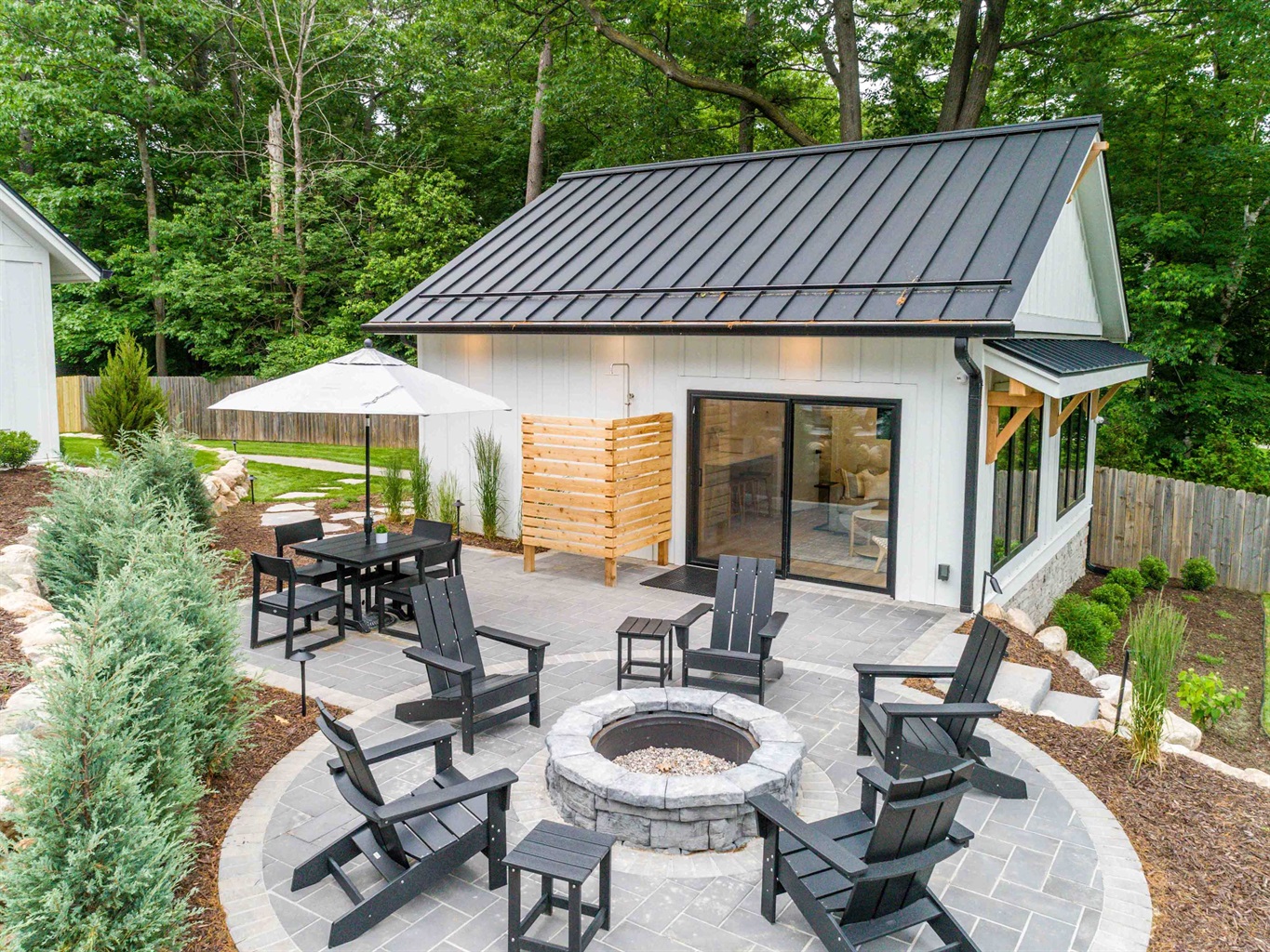The open-concept living space creates an inviting flow, while a private outdoor dining area with a fire pit and outdoor shower offers the perfect place to unwind after a day on the lake.