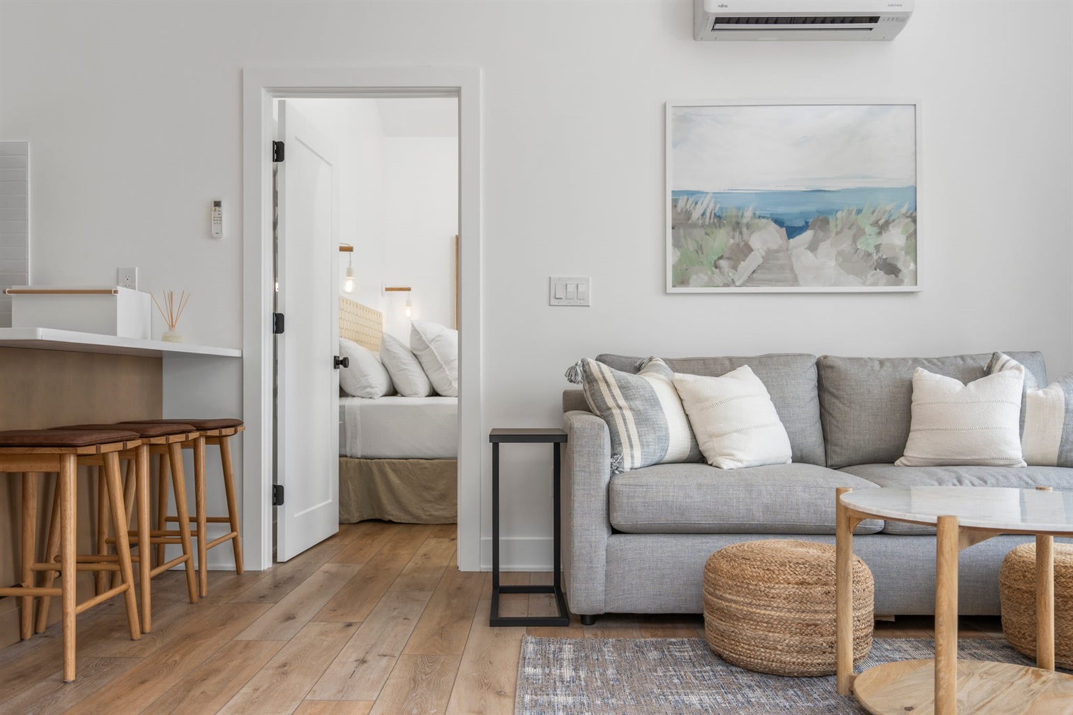 2 Bedrooms • 1 Bathroom 1 Bath • Sleeps 3-6This two-bedroom, one-bath cottage offers beautiful lake views and a relaxed, private setting. The interior features high-end finishes and thoughtfully curated furnishings, creating a refined yet comfortable atmosphere throughout. The layout includes one king bedroom and one queen bedroom, along with a living room featuring a queen sleeper sofa, a fully equipped kitchen, and a full bath. Minutes from Downtown Traverse City!